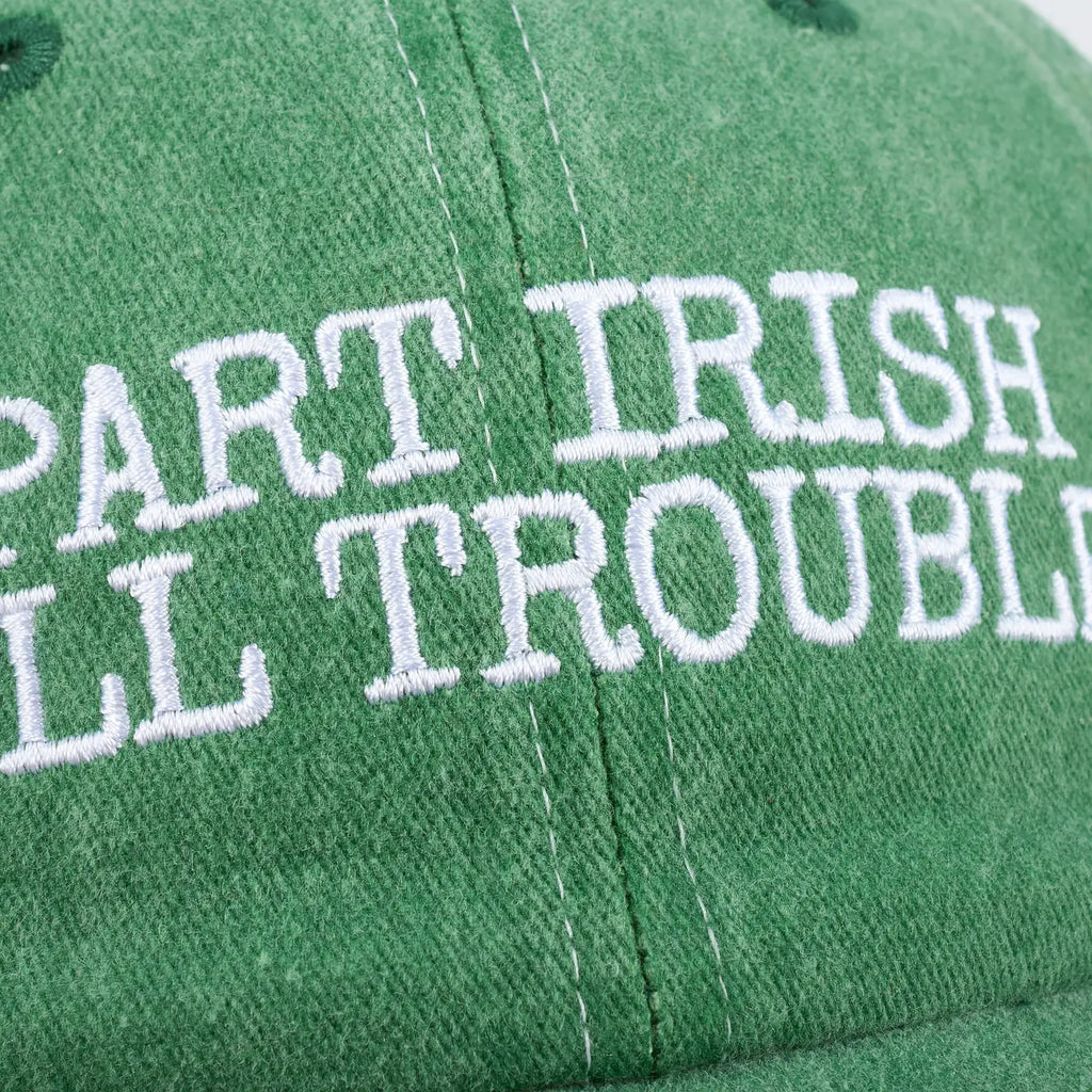 A stonewashed cotton baseball cap in a shamrock green color with a funny seasonal sentiment on the front that reads "Part Irish - All Trouble" as well as coordinating white shamrock designs on the back. Funny St. Patrick's Day hat features fully embroidered designs for added detail. Our Part Irish baseball cap is one size fits most with an adjustable metal buckle to create the perfect fit. Hand wash only. A fun St. Patrick's Day accessory perfect for seasonal style.