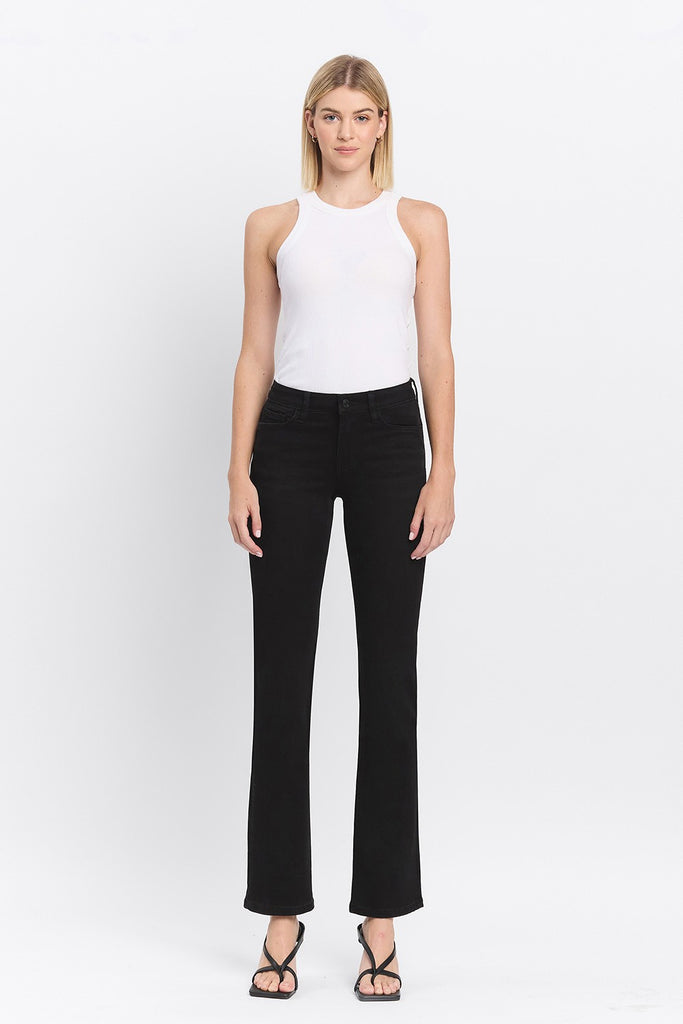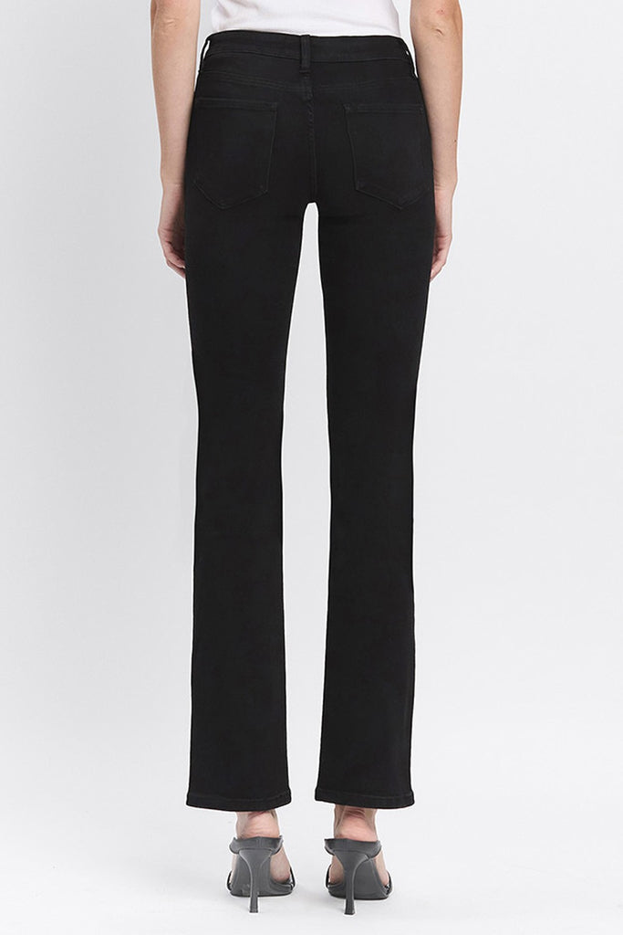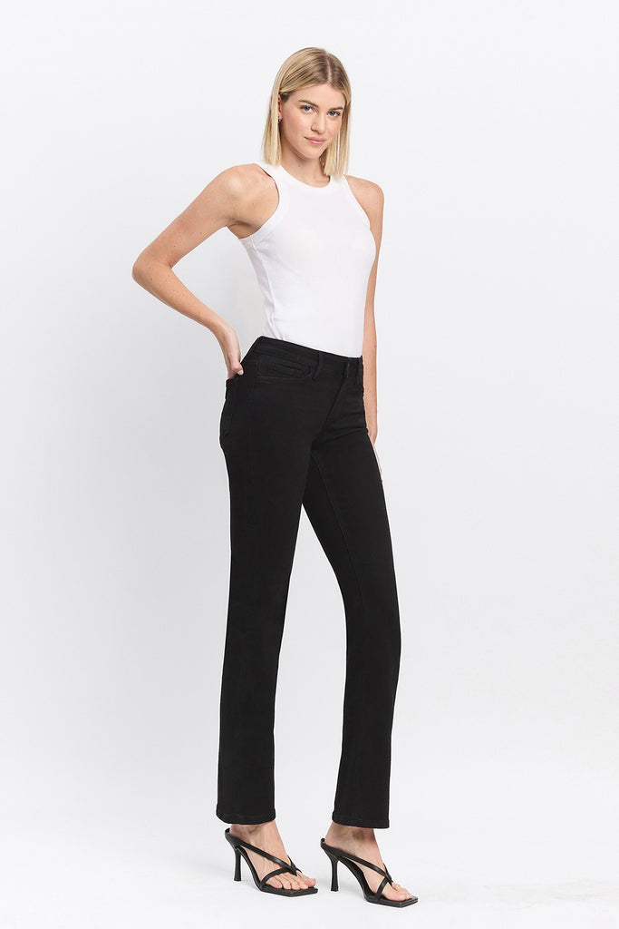 These black bootcut jeans offer a comfy mid-rise fit and stretchy denim for easy movement. Perfect for all-day wear with a flattering full-length cut.