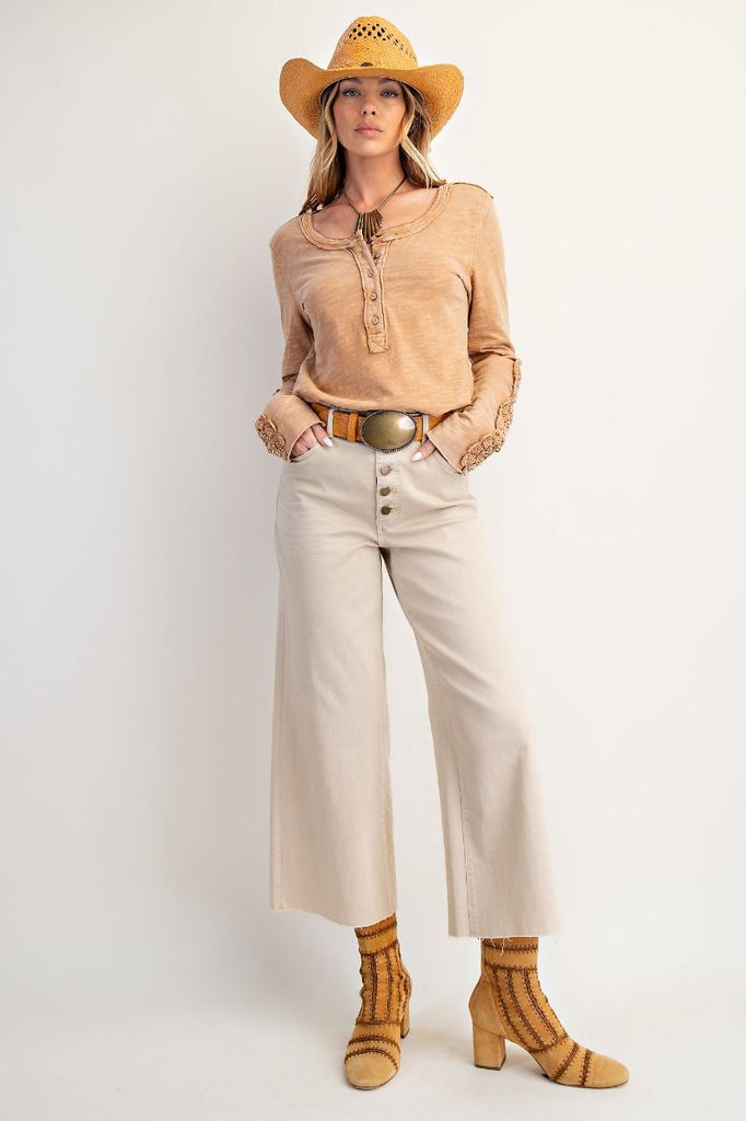 Crochet Lace Top Meet your new favorite layering piece. This washed cotton top features delicate floral crochet detailing, long sleeves, and a softly scooped neckline. Button front and relaxed fit make it endlessly wearable and fun.