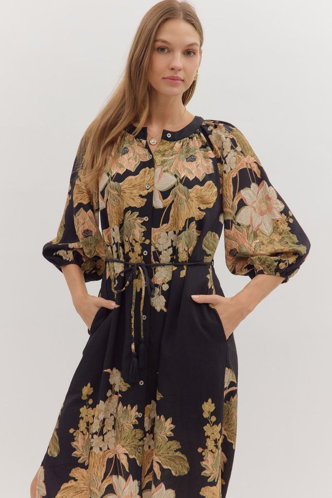 Floral print long sleeve midi dress featuring button closure at front and adjustable drawstring waist. Elasticated sleeve openings. Side pockets. Lined. Woven. Non-sheer. Lightweight.
