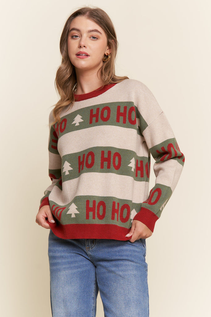 Women's Christmas pullover sweater top. Designed with a stripe color block "HoHoHo" pattern.