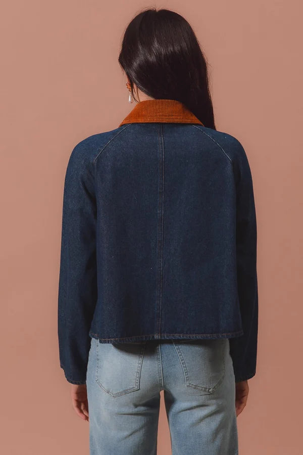 This denim jacket with a corduroy collar zips and buttons up for a cool, casual look with a fun twist.