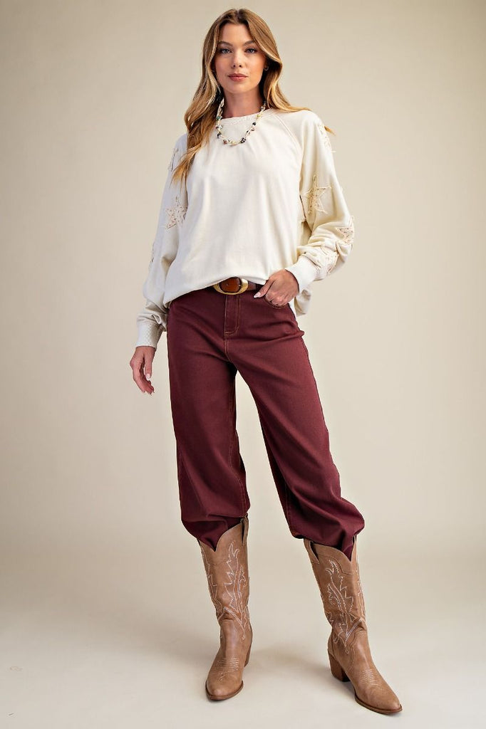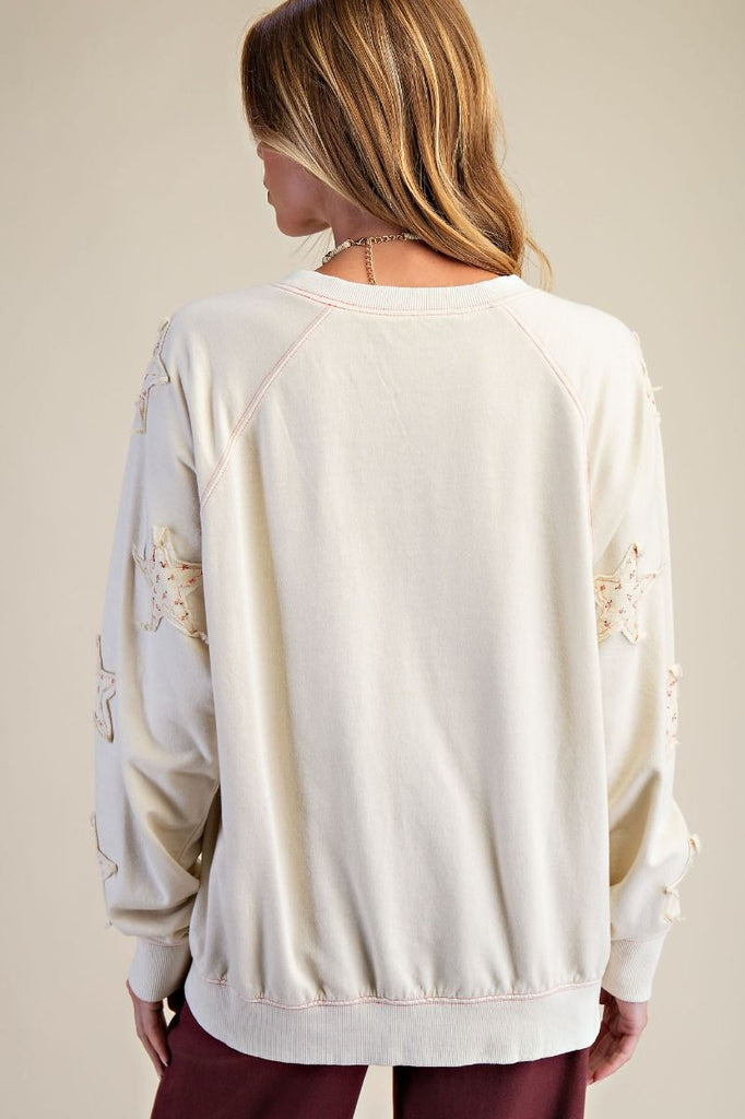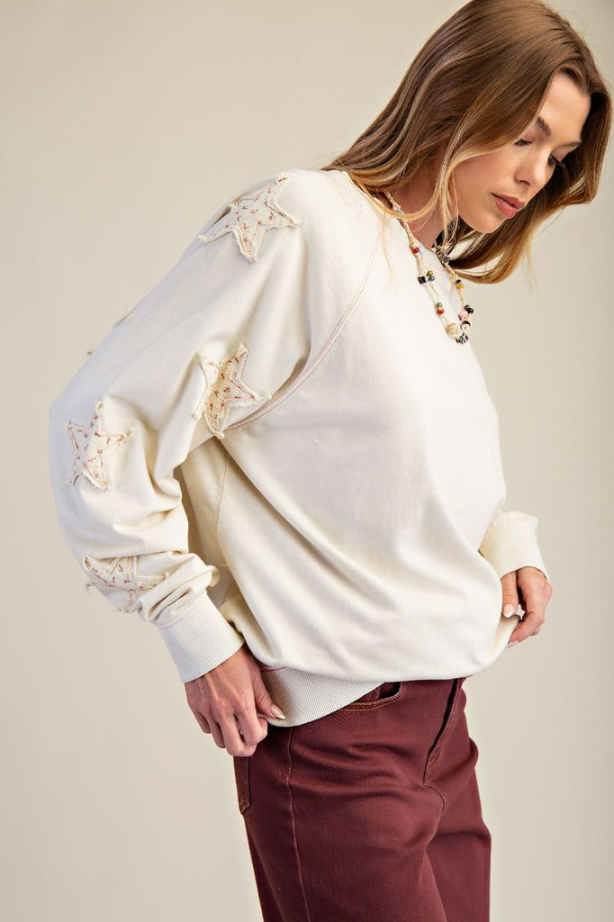 Cozy meets cute in this washed terry pullover adorned with charming star patches featuring tiny floral prints. The relaxed fit and crew neckline make it perfect for lounging or layering, while the mineral wash gives it an effortlessly soft, vintage vibe.