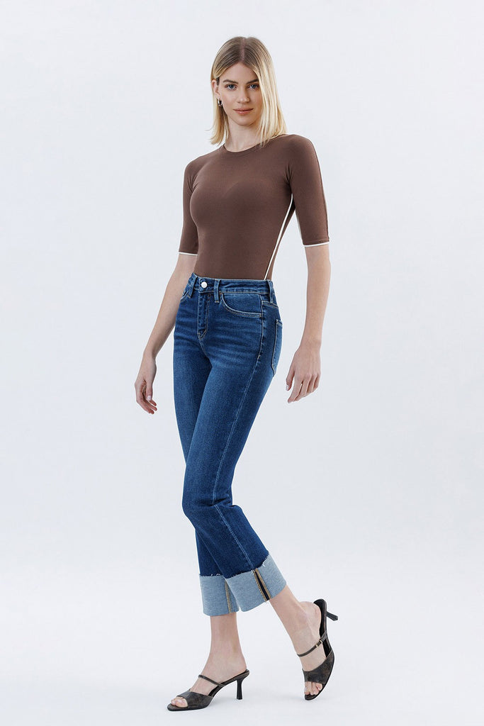 Sagacity Jeans feature a high-rise waist with a slim straight fit and a fun cuffed hem. Made from stretchy denim, they’re comfy and stylish with a touch of distressing. Perfect for a cool, casual look!