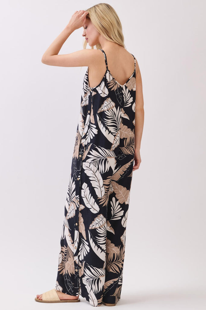 This playful jumpsuit features wide legs and charming side buttons for a breezy, tropical look. Perfect for sunny days!