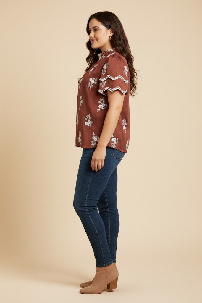 Plus-size top featuring delicate floral embroidery, a charming ruffled neckline, and scalloped lace sleeves that add the perfect touch of whimsy to your wardrobe!