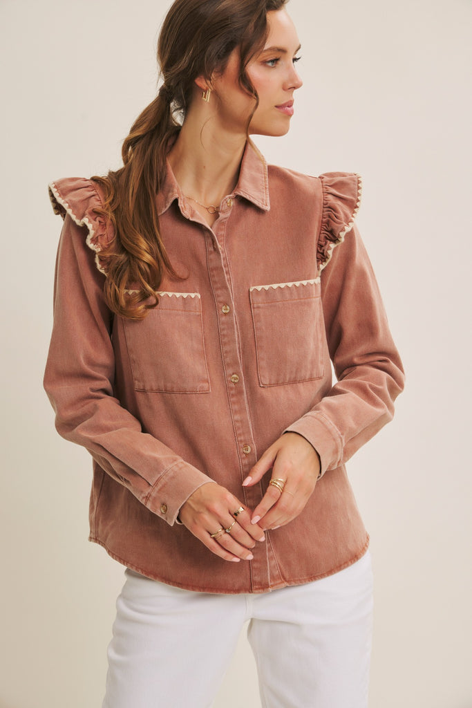 Mineral-washed cotton twill shacket featuring button-down front, dual bust pockets, and feminine ruffle shoulders with embroidery. Classic Western look with a romantic twist. Easy to style open or closed. Perfect for layering through transitional seasons. Made with 100% cotton for comfort and breathability.