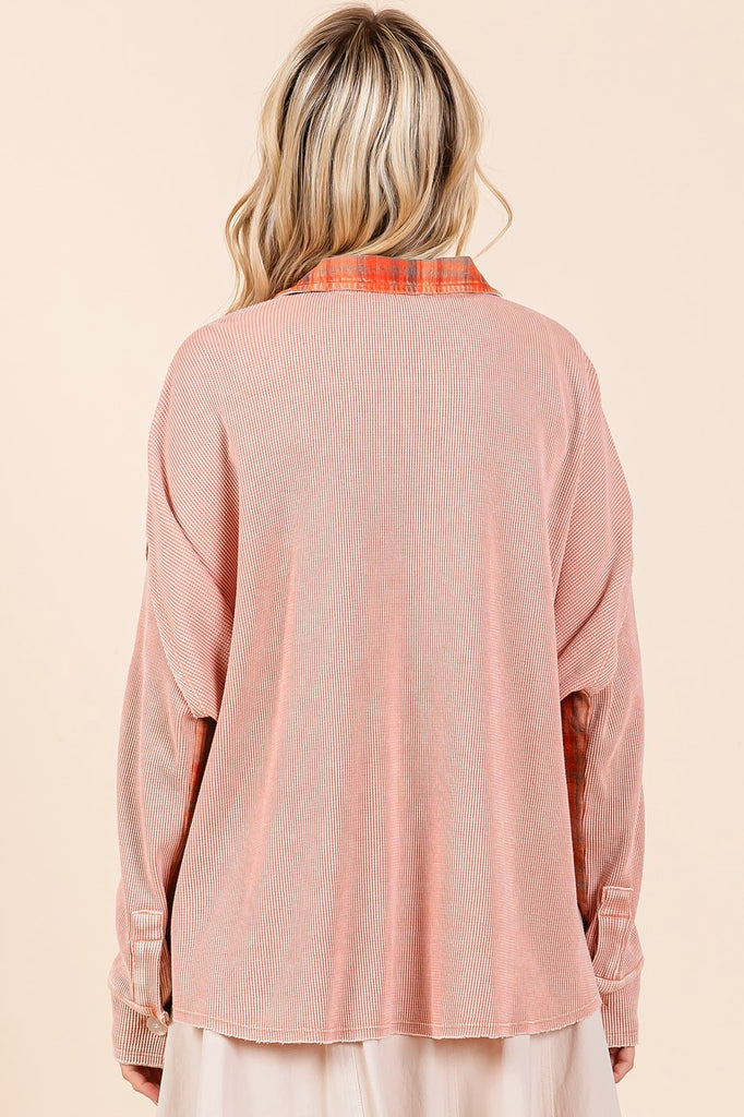 Cozy up in this oversized Orange Sherbert shirt made from soft waffle knit fabric. Featuring playful plaid details on the collar, cuffs, and pockets, plus a button-up front and long sleeves. Perfect for layering in style!